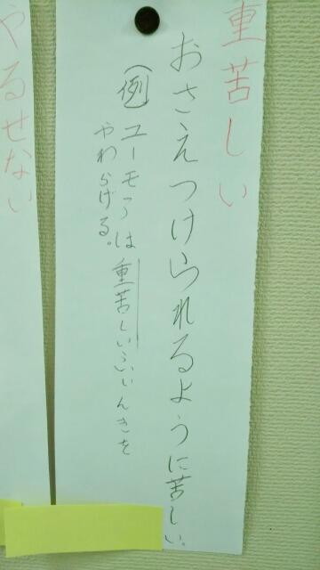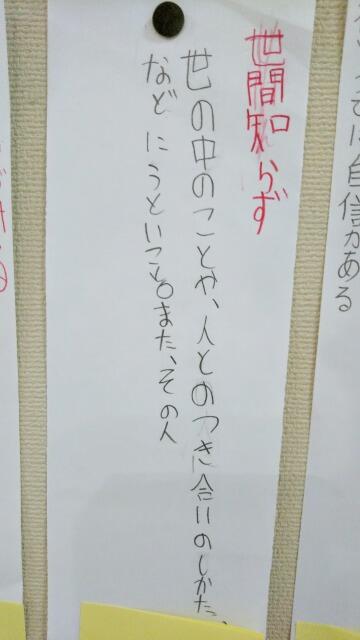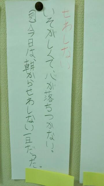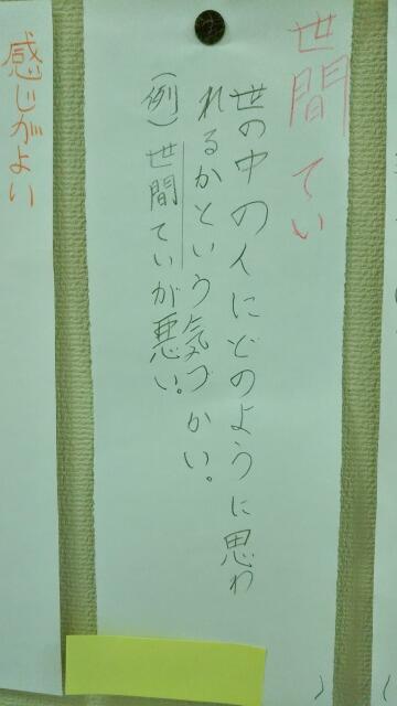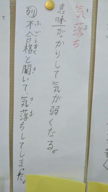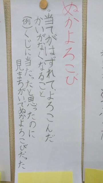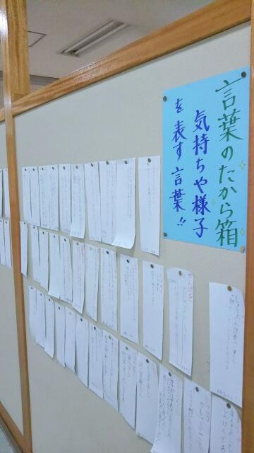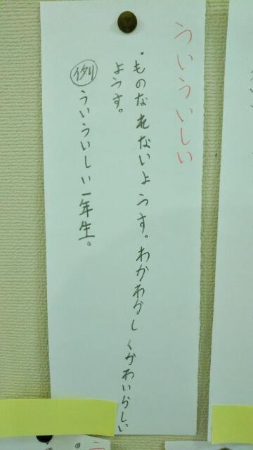 先週から「言葉の宝箱!気持ちや様子を表す言葉」が掲示されていました。児童が言葉の意味を考えて自ら辞書で調べて、例文を考えたそうです。
