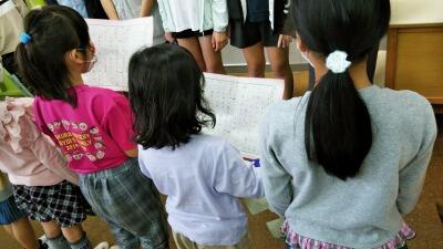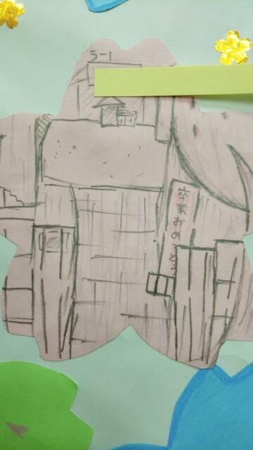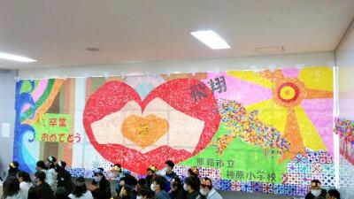 今日は、5年生が6年生へ書いた一言メッセージ、4年生が一枚一枚、丁寧にはさみで切り作った壁画を紹介します。