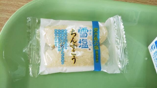 沖縄の伝統菓子のちんすこうに、サンゴが育つ、美しい海も持つ宮古島で生まれた真っ白なパウダー状のお塩=雪塩がかかった「雪塩ちんすこう」が給食に登場しました。