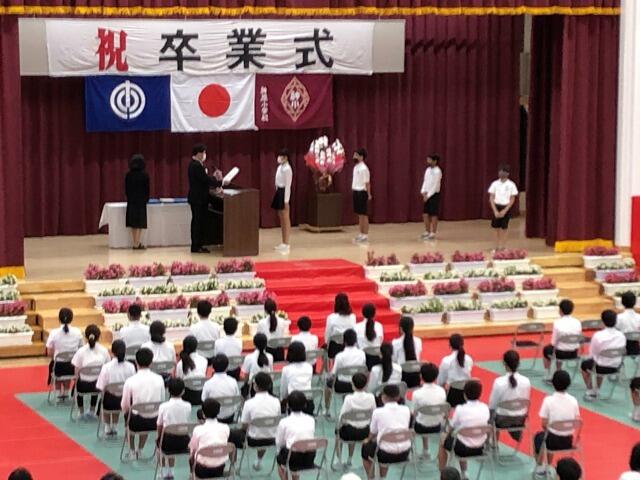 式ではまず児童が一人一人舞台より入場。舞台上で一礼し着席。その後、開式の言葉、国歌ならびに校歌斉唱、卒業認定、卒業証書授与、式辞、記念品贈呈と行われました。