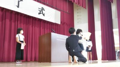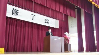 校長先生より、「この1年間を悲観することなく、6 年生で貴重な経験をしたと思ってください。『道がなければ、回り道をいけばいい、それでもなければ道を作ればいい。そして、イルカ(修学旅行の思い出より)のように楽しそうに何度もジャンプすればいい。いつかその日は来る。続けている人にチャンスは来る。ビリーブを忘れず、好きなことに向かってチャレンジを続ける中学校生活を送ってください。」と式辞がありました。