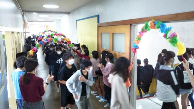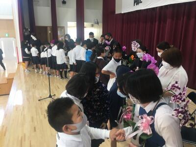 旅立ちを祝い、アーチの花道もつくり、各学年で出迎えて祝福しました。1年~5年生までの教室前へ着くと、それぞれの学年より手拍子で祝福され、「おめでとう」や「ありがとう」など声をかけられていました。