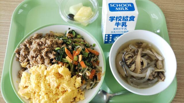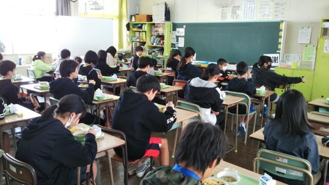②3月23日(火)今年度最後の給食!三色ごはんに琉球料理の中身汁、フルーツのカップ盛り(メロン、パイン、ブドウでした)。そしてそれを黙食(黙って食べる)を徹底する6年生!