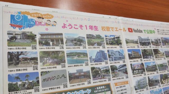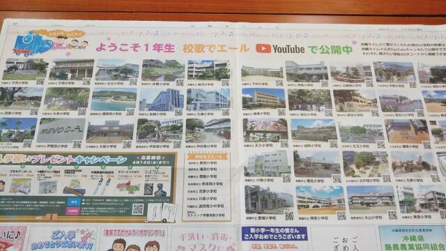 記事には「この春から新1年生になるみなさん、小学校入学おめでとうございます。元気いっぱいで入学式の日を迎え、楽しい学校生活を送ることを願って沖縄県内の小学校45校から校歌でエールを贈ります。」と掲載されております。