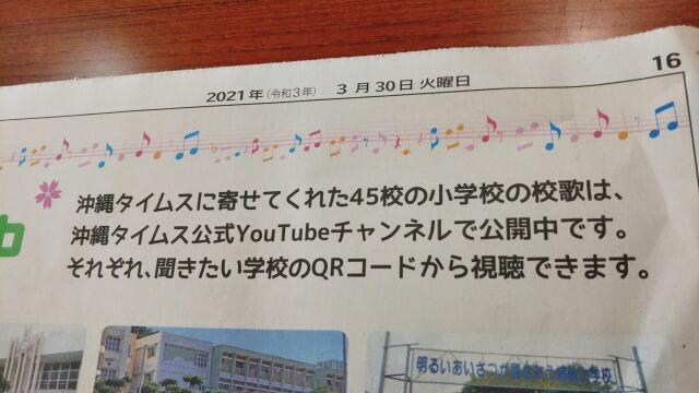 3月31日の沖縄タイムス朝刊の2ページにわたり、県内45の小学校の校歌が写真付きで紹介されておりました。