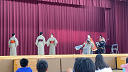 組踊ワークショップでは、「せりふ(唱え)・音楽・踊り」という組踊の3要素や楽器の紹介などを実演を交えて解説していただきました。また「座り方」や「摺り足」の所作の実演指導。さらに、3人1組になり、「二童敵討(にどうてきうち)」で阿麻和利(あまわり)が二童(鶴松と亀千代)に酒盛りの席で踊りながら敵討ちされる場面を実演をさせてもらうなど、伝統文化を楽しく、分かりやすく体験させていただきました。