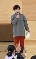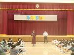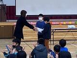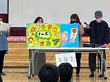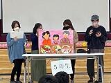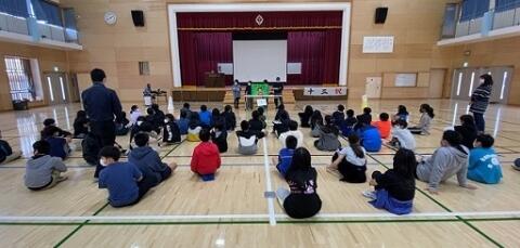 2月22日(火)の5、6校時に体育館において、5年生PTA主催による「十三祝い」が行われました。5年生は、人生初の生年(トゥシビー)祝いです。生まれた干支を初めて迎える数え13歳の節目に、子どもの成長を喜ぶとともに周りへの感謝の意を表す風習です。その内容も盛り込んだ大型絵本の読み聞かせが、行われました。お母さん4名よる読み聞かせは、とても上手で、5年生の児童は食い入るように鑑賞しました。その後、学級代表へ保護者からのプレゼントが手渡されました。
