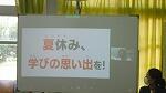 児童の皆さん、明日から夏休みが始まります。健康に留意し、規則正しい生活をしていってください。1学期後半開始日は8月26日(金)です。保護者の皆様、地域の皆様、よい夏休みをお過ごし下さい。