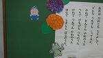 1学年の掲示板には、「あめのひもたのしいね・あめとあそぼう」と題して雨の日に児童の皆さんが見つけたことや感想が貼られています。「かえるなどの生き物を見つけたり、水たまりの様子、雨の音」等々、素直に感じた思いを一人一人貼っていました。