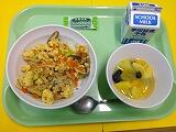 本日の給食は読書月間の図書コラボメニュー最終日です。「アッチとドッチのフルーツポンチ」より、カラフルな「フルーツポンチ」が提供されました。児童の皆さん、涼しげな見た目の甘い味を楽しんでいました。