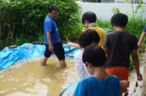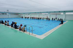 4年生がプールに集合しています。