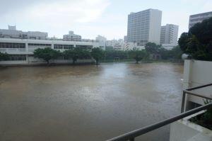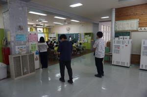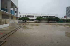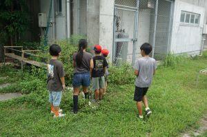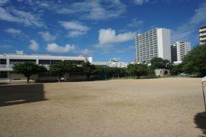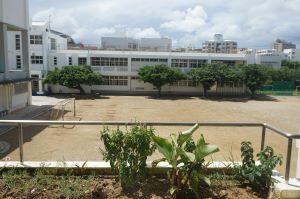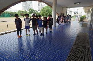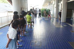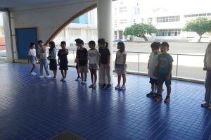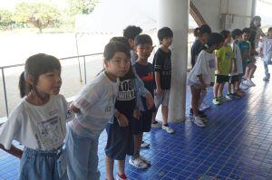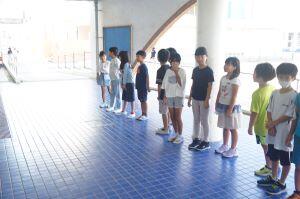 大城先生と一緒になって元気よく朝のあいさつを校庭に響かせています。