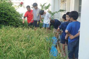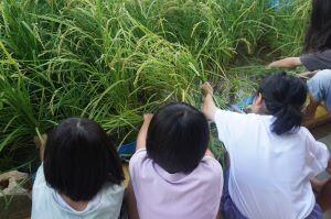 息づいて実らせた稲を、5年生のお友達がしっかりと刈り取っています。