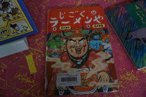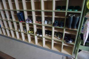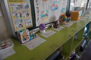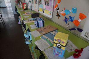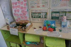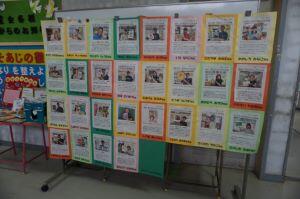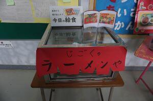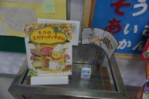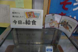 児童玄関前に、名城先生作成の絵本と給食セットがあります。
