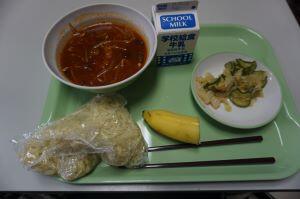 とうとう、給食時間です。スープ真っ赤じゃん・・