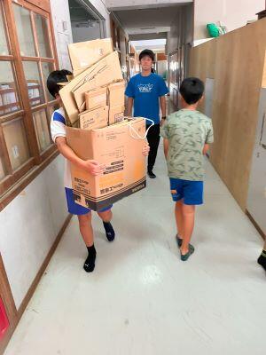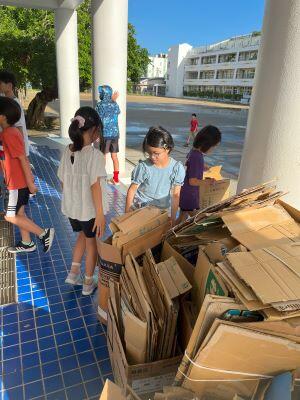 「今日古紙回収が来まーす!!お手伝いできるお友達は2号棟に集合お願いします!」って