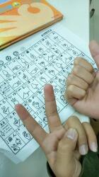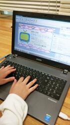 ⑨手話クラブは、指文字の練習をしていました。沖縄の名曲を手話でするため、映像もみていました。