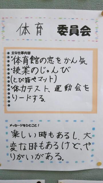先週より、委員会選択に向け5年生がわかりやすいようにと、6年生は仕事内容の説明や一言メッセージを書き、階段横へ掲示しています。
