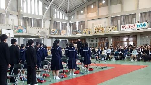 生徒会執行部や各専門委員長、各部活動代表の皆さん、今日のために周到な準備をしてくれ、ありがとうございます。皆さんの、新入生を暖かく迎え入れようとする熱い思いがとても嬉しく、頼りになるリーダー達です。新入生は、憧れのまなざしで執行部や専門委員会の説明を聴いていました。新入生の皆さん、皆さん一人一人が生徒会の一員なのです。先輩方と一緒に神原中学校の生徒会を盛り上げて下さいね。