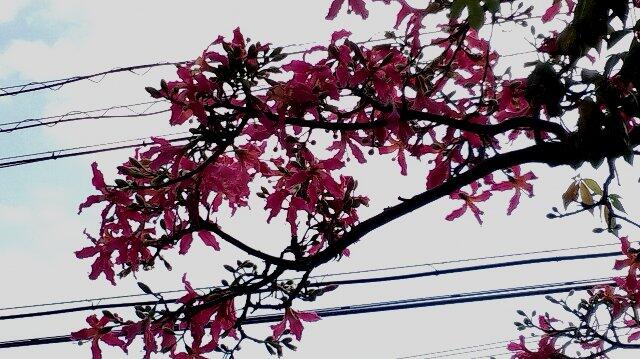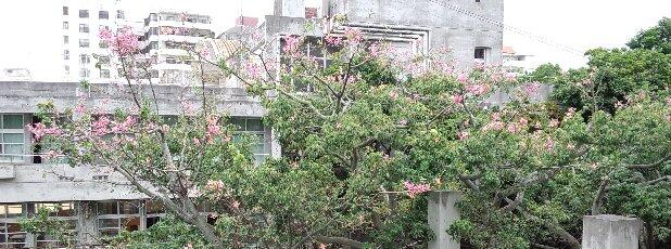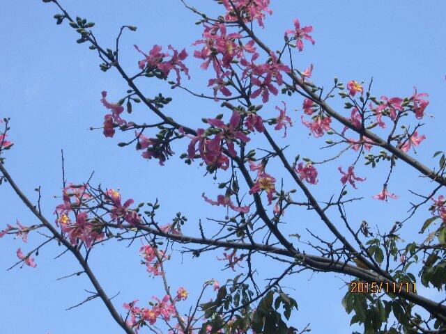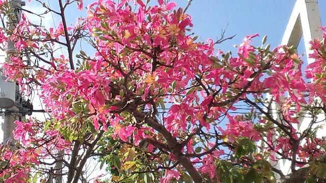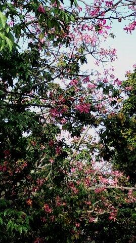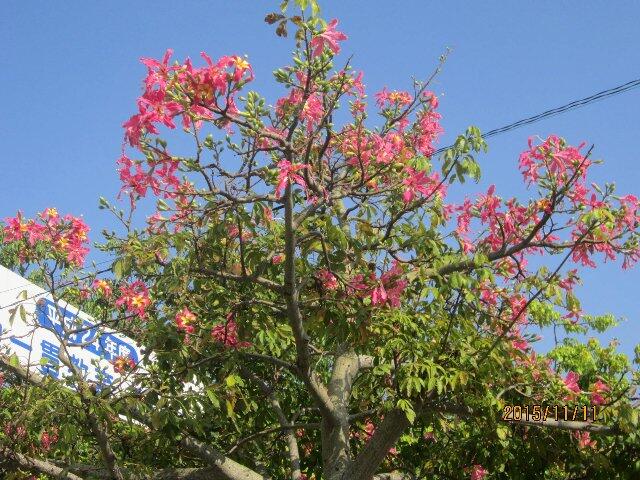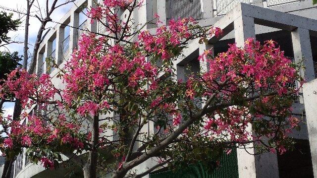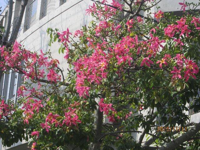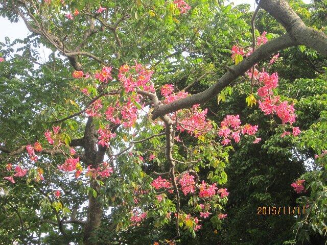 先週あたりからトックリキワタの花が咲き始めているのが見られます。まだまだ葉っぱのついた状態で,道路側から二番目の木です。台風の接近が気になるところですが・・・。写真は→
