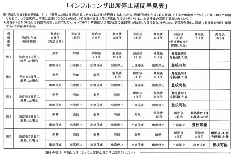 校内においてインフルエンザ罹患した生徒が増えています。出席停止に関する早見表を参考にしてください。