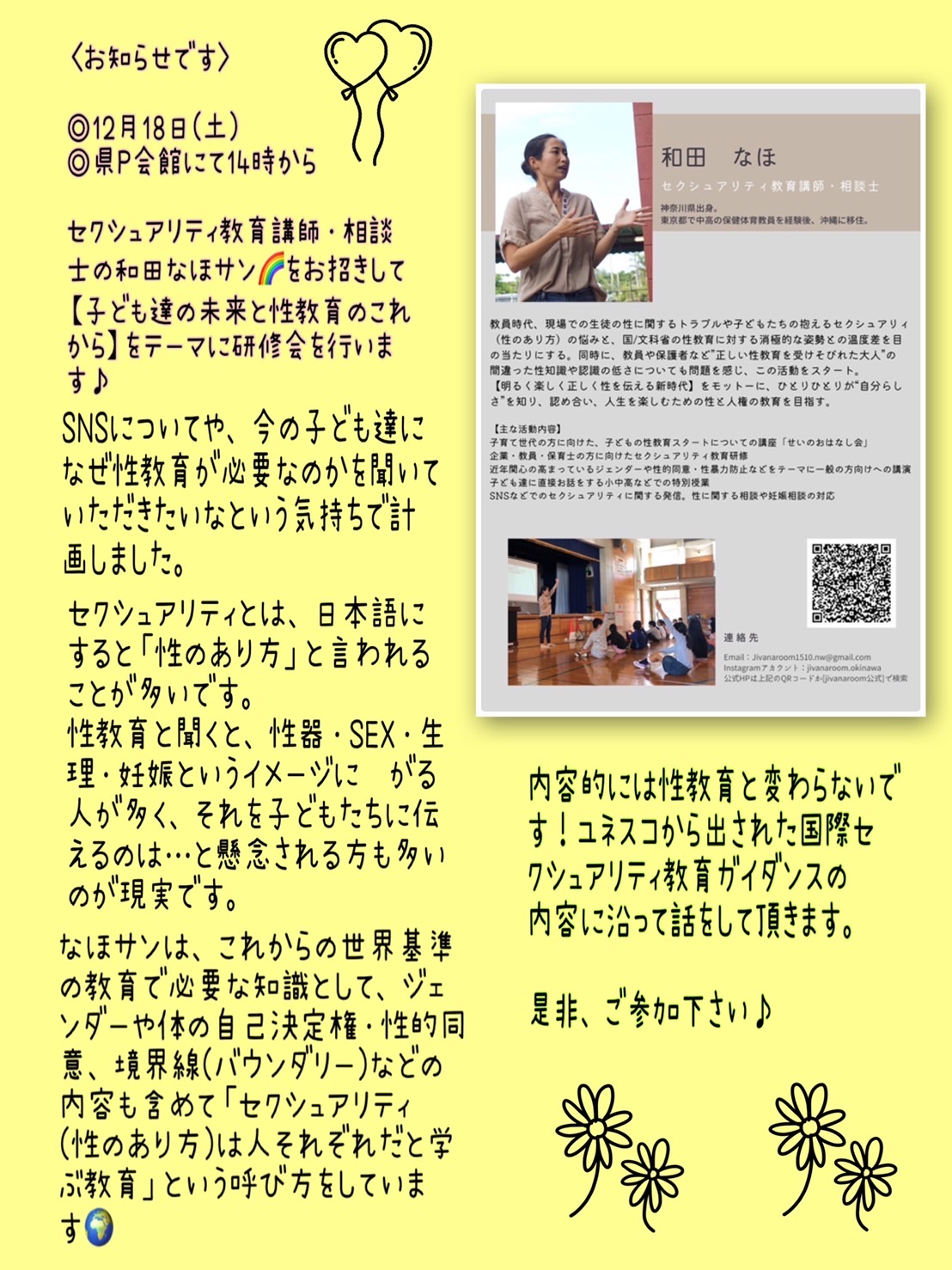 「子ども達の未来と性教育のこれから」をテーマに研修会を行います。