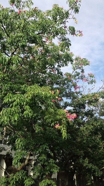 先週あたりからトックリキワタの花が咲き始めているのが見られます。まだまだ葉っぱのついた状態で,道路側から二番目の木です。台風の接近が気になるところですが・・・。写真は→tokuri1020.jpg