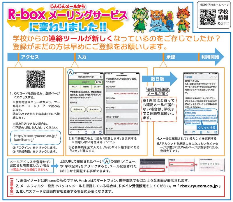 一斉メールシステム「R-box」のご登録をお願いします(ご登録方法については、本校ホームページに掲載されております)。