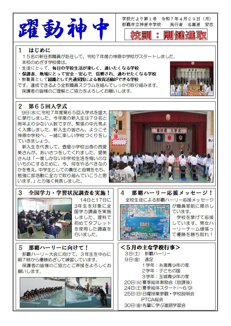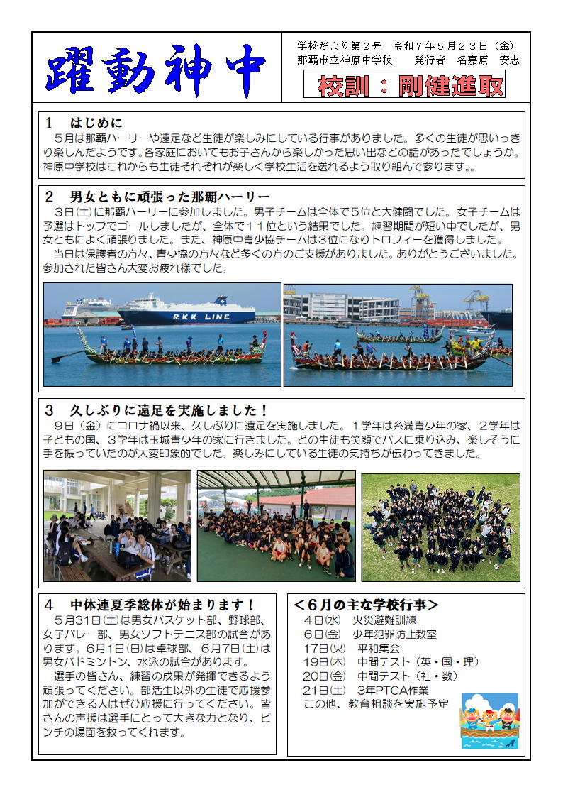 2月の給食献立・詳細献立表 02/04 学校だより⑨ 01/28 1月の給食献立・詳細献立表 2025/12/24 冬服完全実施のお知らせ 2025/12/19 R7 学校だより第7号 2025/12/19 {{item.Topic.display_title}} {{item.Topic.display_publish_start}} もっと見る