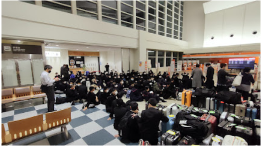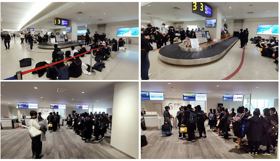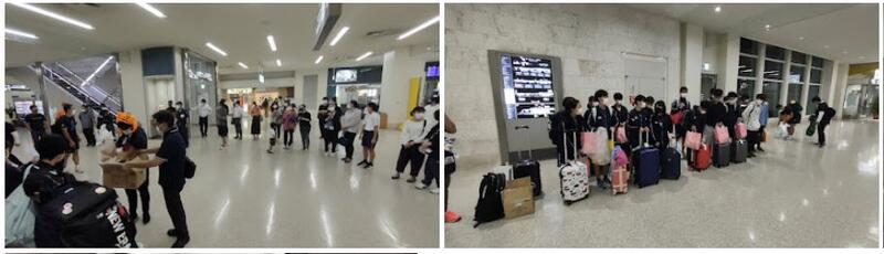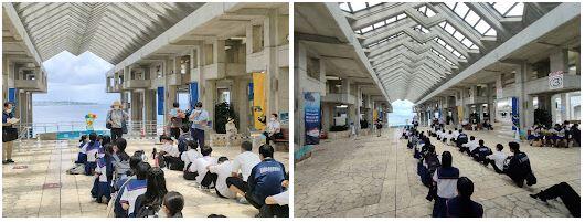 那覇空港には、県内の事業所や児童施設などから、数十点の美術作品や写真などが展示されており、その素晴らしい作品の数々に心を打たれました。吹奏楽部はそのセレモニー内で、30分ほど9曲を演奏させていただきました。クラリネット担当で放送委員である2年の漢那さんによる日本語での曲説明に合わせて、フルート担当生徒会副会長である1年の陳さんが英語と中国語を交えながら、司会進行を担当してくれました。