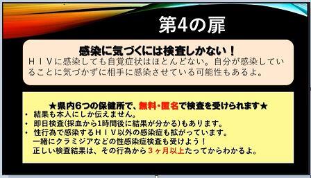 エイズ学習会を通して、沖縄にも440人のエイズ感染者がいることを初めて知りました。だから、感染しないためにも気軽に性行為をしてはいけないと思いました。また、周りの人がエイズに感染してしまっても、差別は絶対にしないようにしていきたいです。