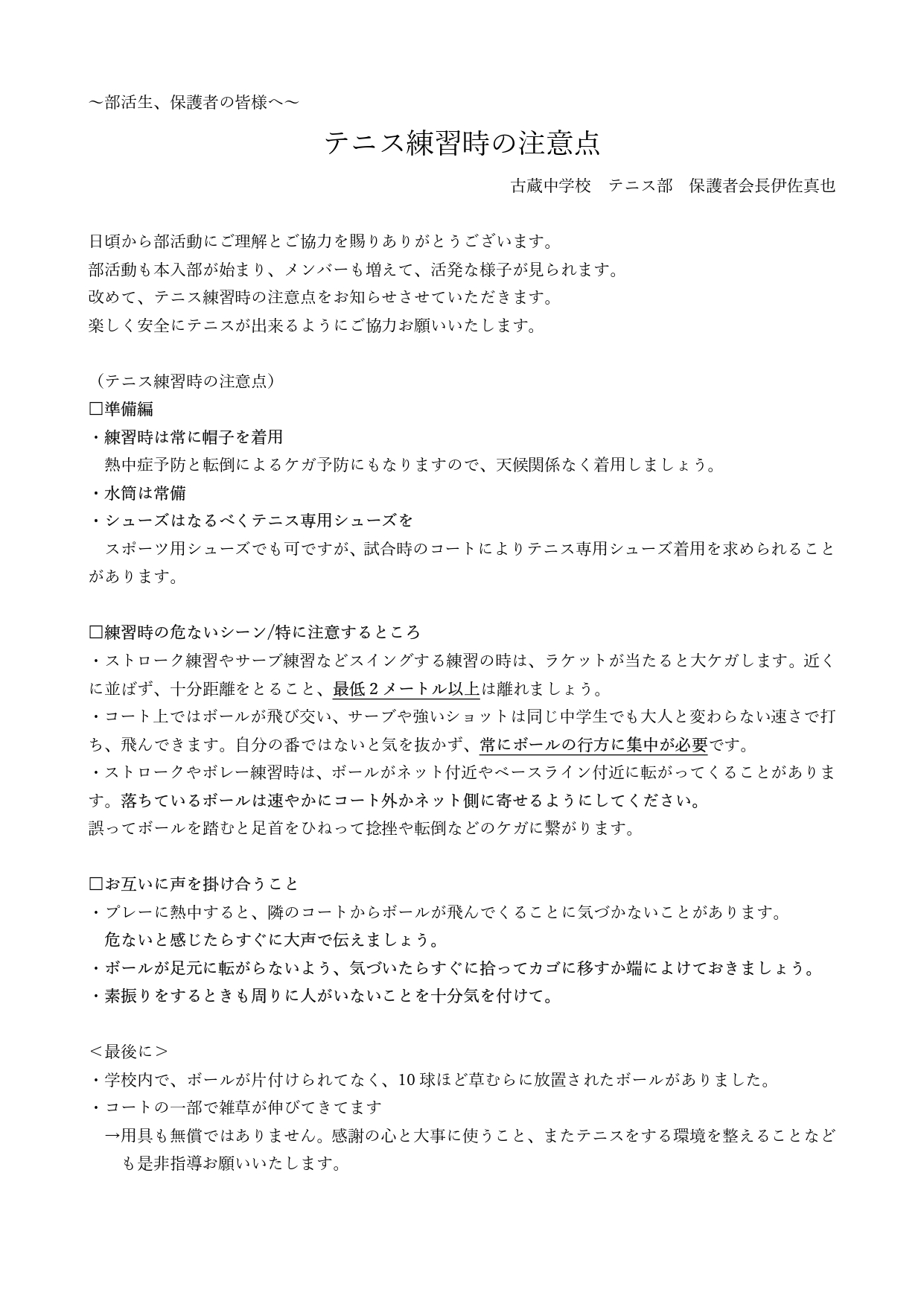| 男子テニス | IMG_4625.JPG IMG_4626.JPG 団体戦 (古蔵中)VS 仲井真中学校 4-1で勝利! 2回戦は、鏡原中学校と対戦し、4-0で敗北 個人戦 ダブルス(3年生) 1ペア県大会出場! |