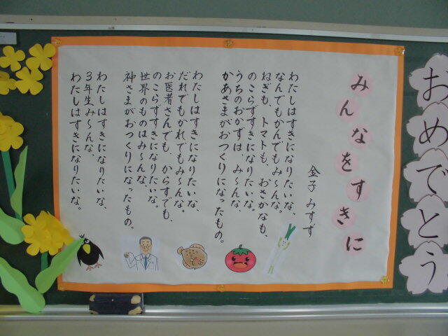 私はすきになりたいなで始まるこの詩。クラスのお友達も、先生も、違う学年の子も、教室も学校もみんなみんな好きになって・・・。