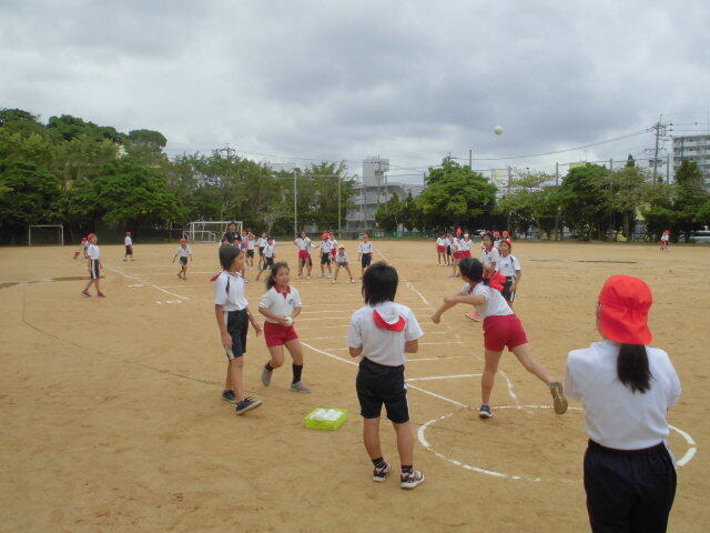 運動場では3年生と5年生が、ボール投げと50m走を行っていました。