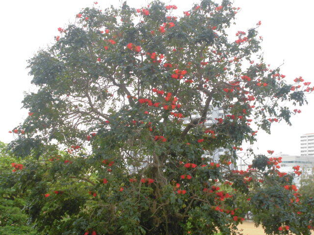 正門前のカエンボクの朱色の花が咲き誇り見事です。デイゴの花とばかり思っていましたがカエンボクという木の花でした。