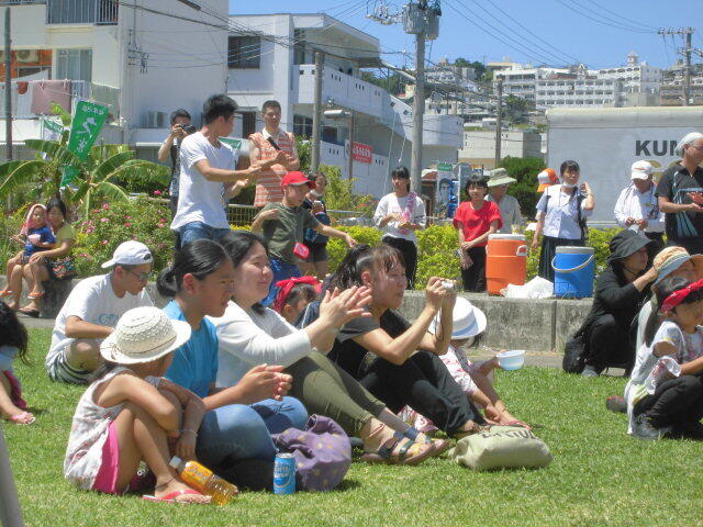 地震津波避難訓練で、真和志高校グランドの高台にみんなで避難しました。