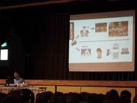 校長先生は、431名真地っ子全員が夢希望を持つ右の円グラフのようになってほしいと願っています。「真地っ子夢・希望100%」が校長先生の夢・希望です。また夢・希望の持ち方について教える「夢新聞」の取組も紹介されました。