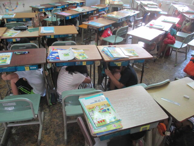 地震がおきました、ゆれがおさまるまで机の下にもぐります。放送や先生の指示を聞いておさない、かけない、しゃべらないで避難します。あいことばはもちろん「おかしもちな」