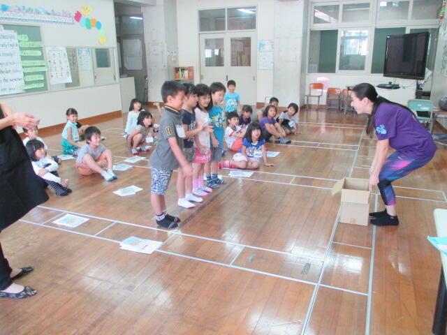写真は一年生の英語の授業の様子です。英語で数を数える活動で、段ボールの箱の中にボール投げ入れようとしている場面です。