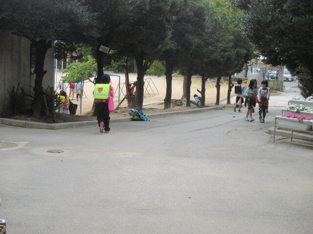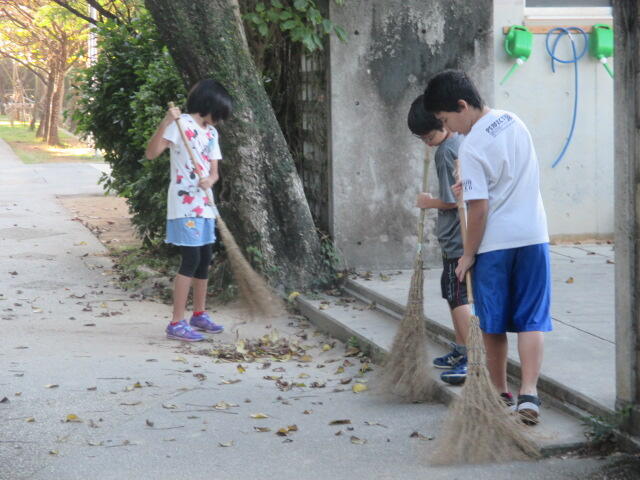 季節はもうそろそろ秋の気配。カエンボク等の葉っぱが大量におちます。落ち葉が増え、朝の活動にも熱がはいります。花壇を耕している子もいます。