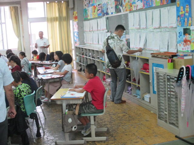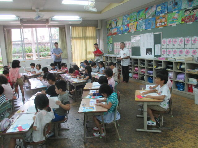 今日は那覇教育事務所の先生方が本校の授業参観にいらっしゃいました。授業や学級、子どもたちの様子や作品などを見て、参観者はとても感心していました。特に、子どもたちがしっかりと聞いて、考え、自分の意見をいう姿に100個のほめ言葉をいただきました。
