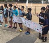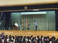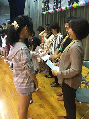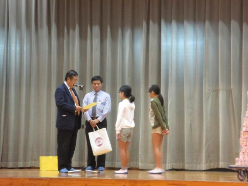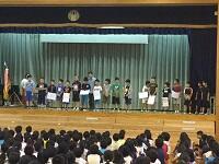 プレゼンテーターの児童が賞状とメダルを渡します、児童代表のお礼の言葉もありました。活動者を代表してあいさつがありました。「現在蝶園には蝶が一頭もいません。しかし、なんとか家で数頭の蝶が生まれました、みなさんのためにもがんばって数をふやしていきます」「那覇市体育館の前で13年間交通立哨しています。みかけたらあいさつとこえかけをお願いします」子供たちは静かに聞き入っていました。