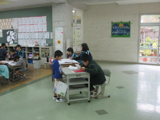 体育では1年生が力をあわせて背中で立ち上がります。版画では彫刻刀の使い方4年生、きれいな歌声3年生、英語ではハロウィン、日本の誇れる電化製品は何ですかの5年生、板書とノートが連動していた2年生、そして書いたメモの推敲を子供たち同士で行っていた6年生。