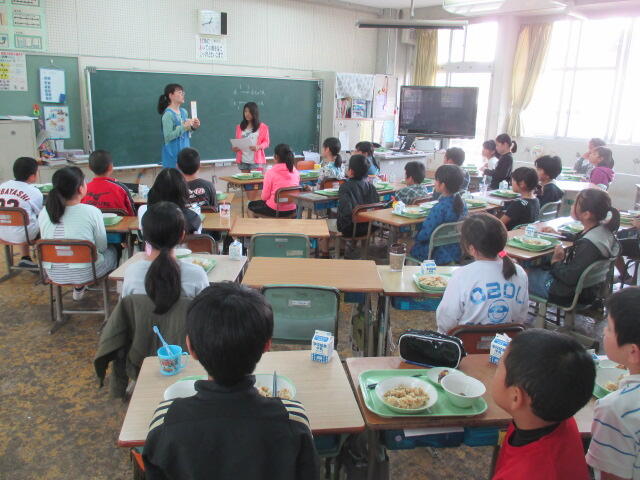 小学校での初めての給食。みんな笑顔で、楽しそうでした。