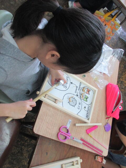 一人一人作業の進捗が違います。作業スペースを広げ隣の子とは違う工程の活動をそれぞれ行っていました。完成にむけて一人一人が、版画版に集中し、取り組んでいました。