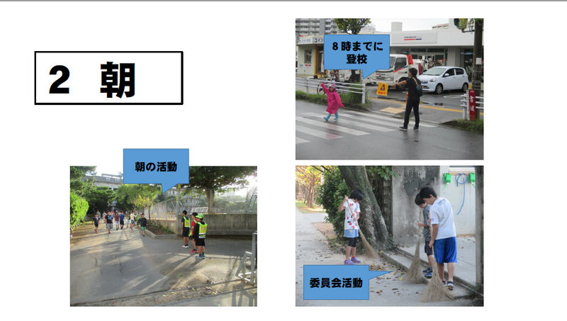 ②の朝についてです。真地っ子は朝が早いです。ほとんどの子どもが7時50分~8時までに徒歩で登校しています。登校したらすぐに朝の活動や委員会活動で汗をかきます。そうすることで朝のスイッチが入ります。今年も続けましょう。