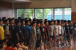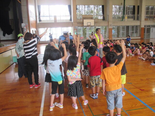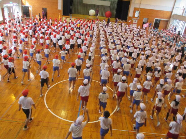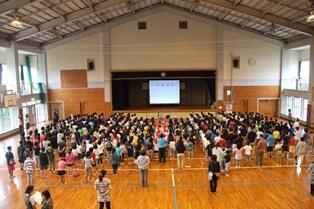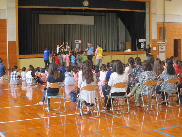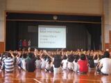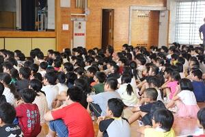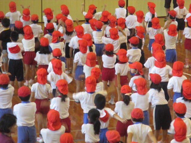 集会では不審者対応の言葉二つがだされました。「おかしもちな」「いかのおすし」の合い言葉です。これは学校内外で不審者から自分の身を守るための行動目標となります。会場では水を打ったようにシーンとなる子供たち。今日の避難訓練は聞く態度もよく合格点でした。