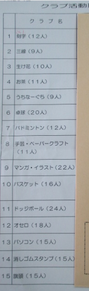 おとうさん、おかあさんの子どもの頃のクラブ活動はなんでしたか。それを子どもに話してみてください。 「へーー」ということで親近感がわいてくると思いますよ。その前にお子さんはどのクラブにはいりましたか。聞いてみて下さい。真地っ子はたぶん、聞かれるのを待っていると思いますよ。