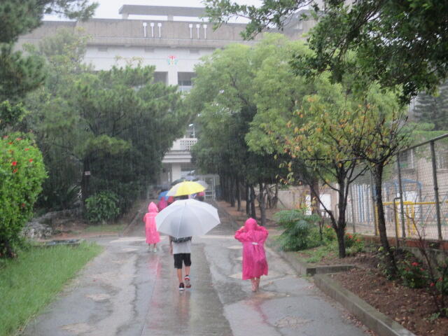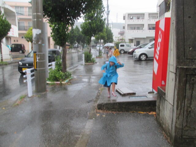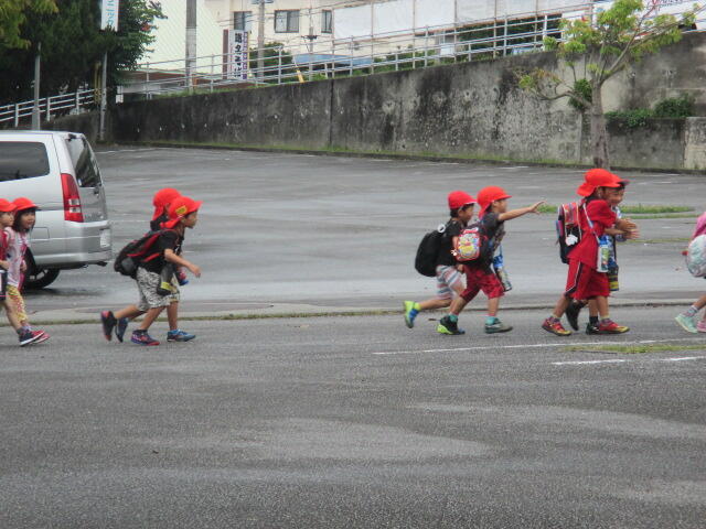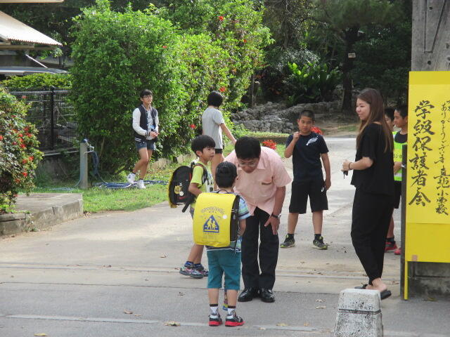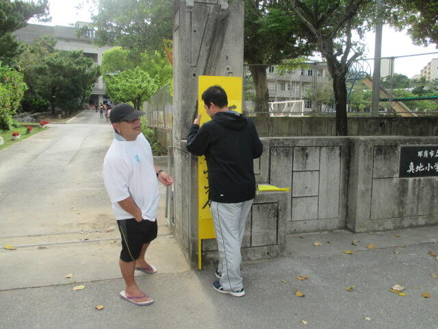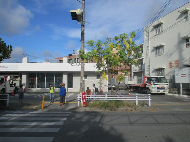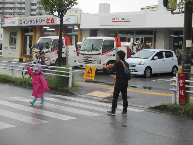 今朝は正門前には交通安全立哨のおとうさんの保護者の方がたたれていました。一方、那覇市体育館前の横断歩道ではおかあさんの保護者の方がたたれていました。