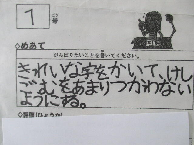 一学期は、勉強がんばりました、三つの力がつきました、ノートの使い方も上達しました、やさしい子がいっぱい生まれました、みんなでいじめをなくしました、運動会かっこよく成功しました。